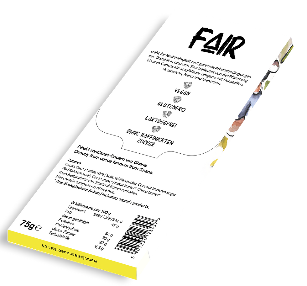 My client FAIR commissions a design concept that will work for two different types of chocolate. Focus of the company: Sustainability in cultivation, fair working conditions and environmentally friendly production in West Africa. The coconut flower syrup is produced in Thailand. Headquarters of the company FAIR is in Switzerland, from here everything is organized and also the packaging takes place here.
