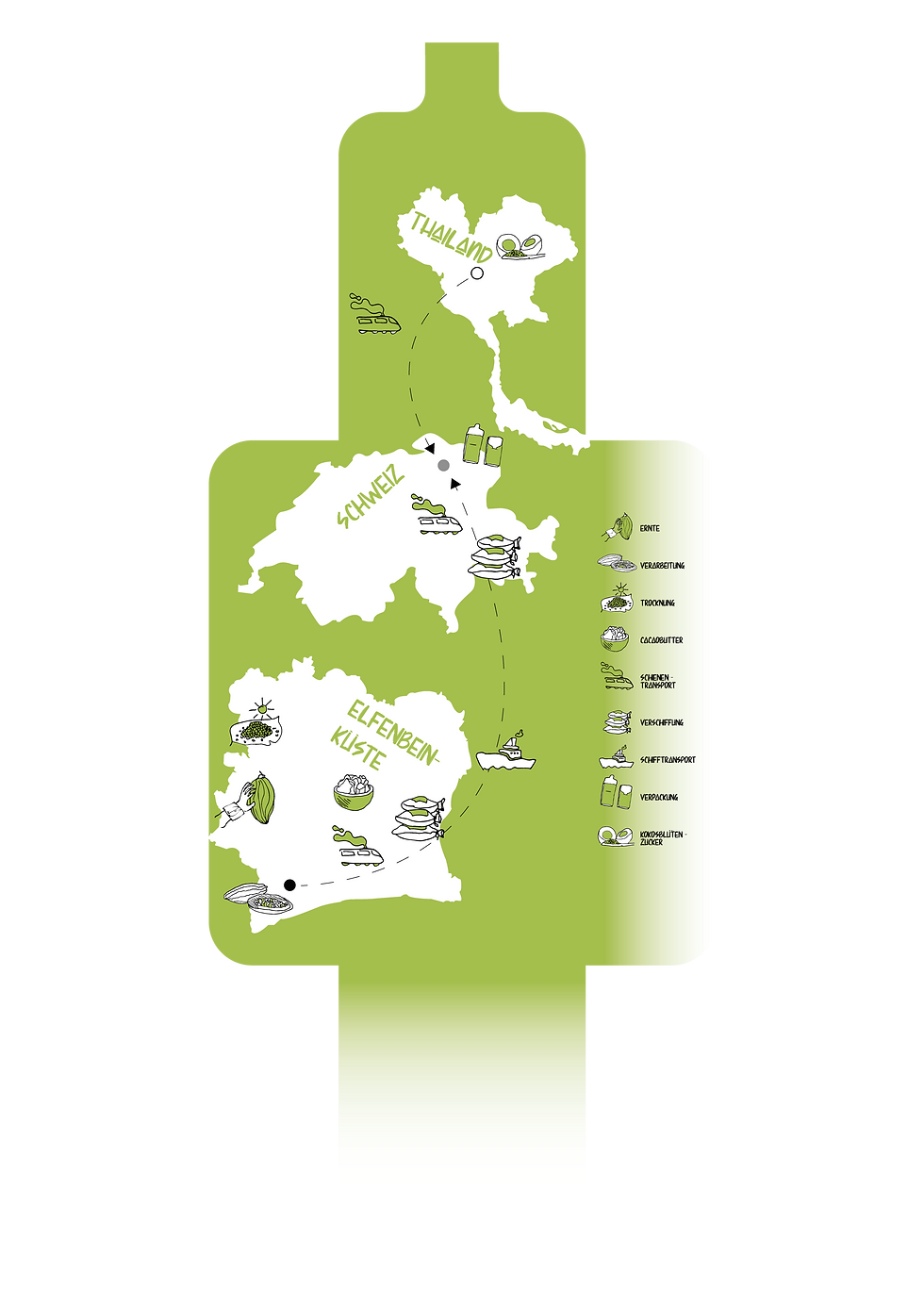 Mein Kunde FAIR gibt ein Gestaltungskonzept, das für zwei verschiedene Schokoladensorten funktionieren soll, in Auftrag. Schwerpunkt der Firma: Nachhaltigkeit beim Anbau, faire Arbeitsbedingungen und umweltschonende Produktion in Westafrika. Der Kokosblütensirup wird in Thailand produziert. Hauptsitz der Firma FAIR ist in der Schweiz, von hier wird alles organisiert und auch das Packaging findet hier statt.